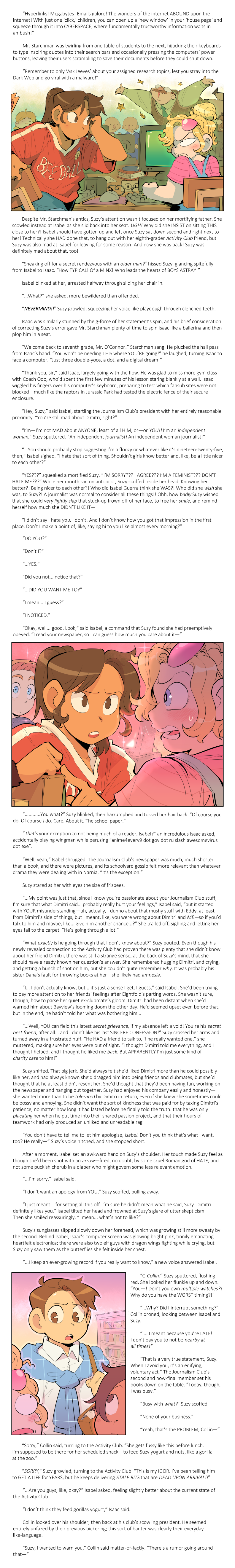 “Hey, Suzy,” said Isabel, startling the Journalism Club’s president with her entirely reasonable proximity. “You’re still mad about Dimitri, right?”